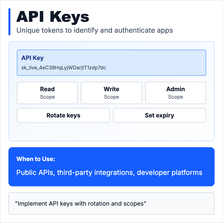 Use API keys for server-to-server authentication (backend calling your API), developer tools, or machine-to-machine access. Not suitable for frontend/mobile apps (keys get exposed). Use separate keys for dev/staging/prod. Provide key management UI (create, revoke, rotate). Pair with rate limiting to prevent abuse. For user-facing apps, use OAuth or JWTs instead.