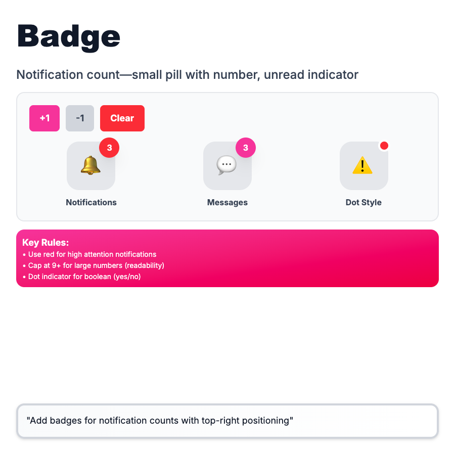 Use badges for status indicators (Draft, Published, Paid), notification counts (5 unread), version labels (Beta, Pro), or categories/tags (Bug, Feature). Keep text short (1-3 words). Use color to convey meaning (red=error, green=success, blue=info). Don't overuse—too many badges create visual noise.