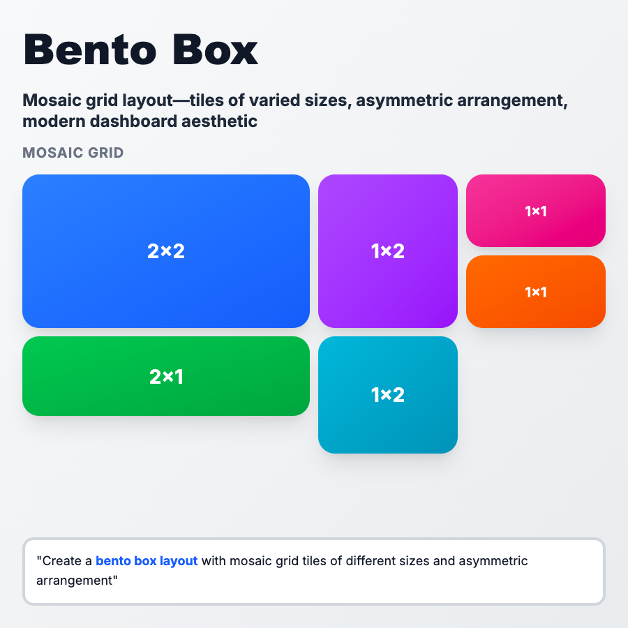 Bento Layout (named after Japanese bento boxes) arranges content in asymmetric grid cells with varying sizes. It combines card-based design with masonry-style composition, creating visual interest through mixed proportions. Popular in modern landing pages, dashboards, and portfolio sites for dynamic, non-uniform layouts.