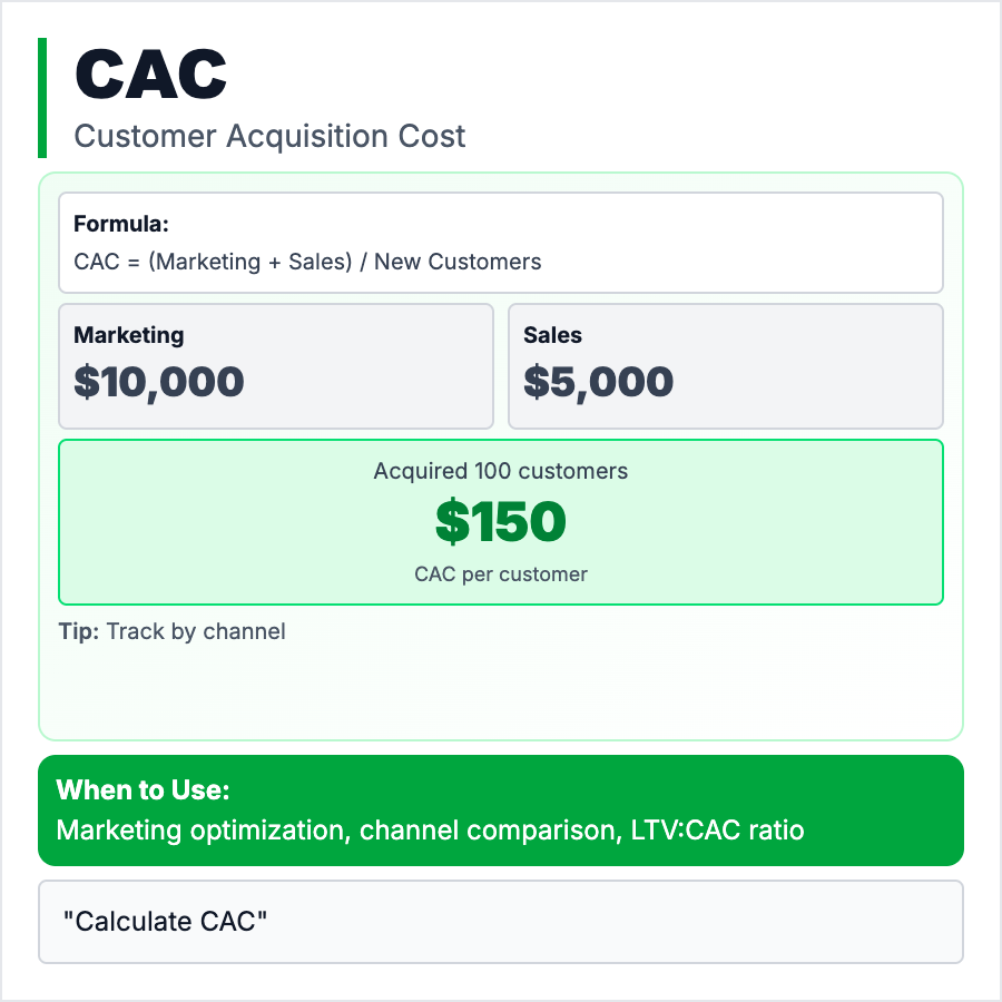 Track CAC as soon as you start spending on acquisition (ads, sales team, marketing). Break it down by channel (Google Ads CAC vs organic CAC), customer segment (SMB vs enterprise), and cohort (CAC often rises over time). Use it to decide which channels to scale and when unit economics work. Essential for understanding if growth is profitable.