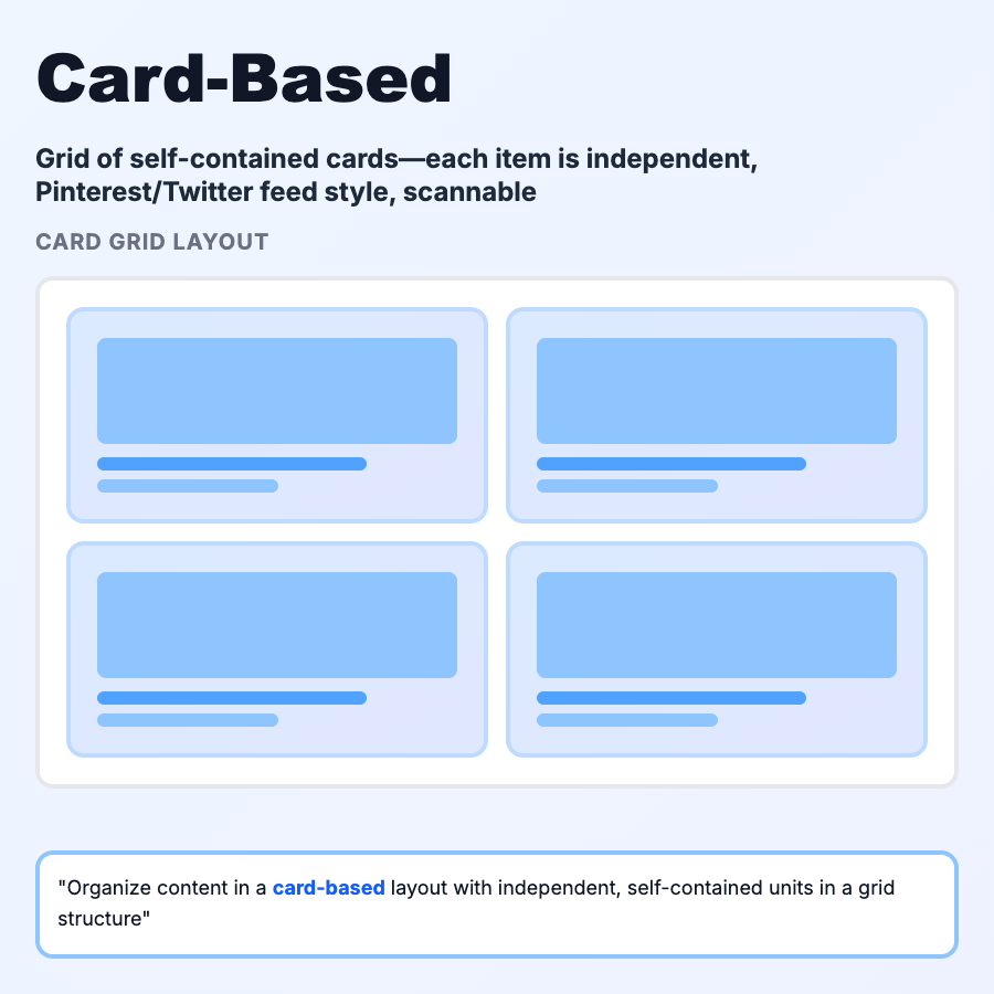 Card-Based IA organizes content into discrete, self-contained units (cards) that users can scan, compare, and interact with independently. Each card contains a preview or complete piece of content. Think Pinterest boards, Trello cards, or product grids. Great for heterogeneous content where items are equal in hierarchy.
