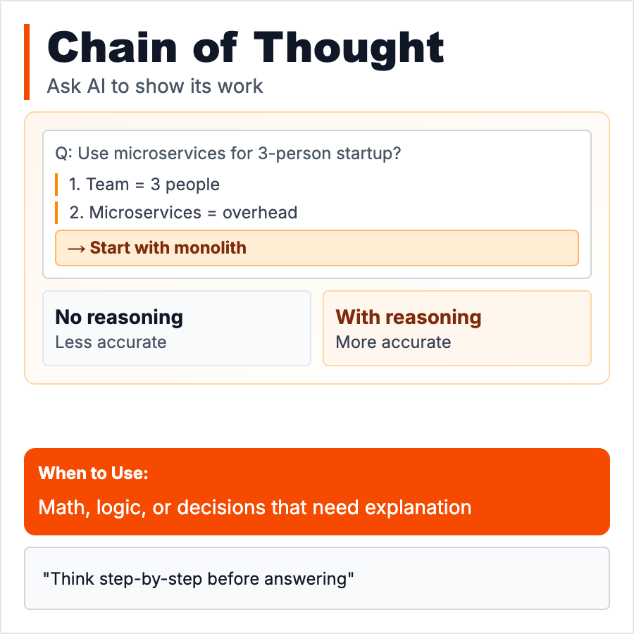 Chain of Thought (CoT) is a prompting technique where you ask the AI to "think step-by-step" or "show your work" before answering. Instead of jumping to conclusions, the AI breaks down its reasoning into intermediate steps—like showing math work in school. This dramatically improves accuracy for logic, math, planning, and multi-step tasks.