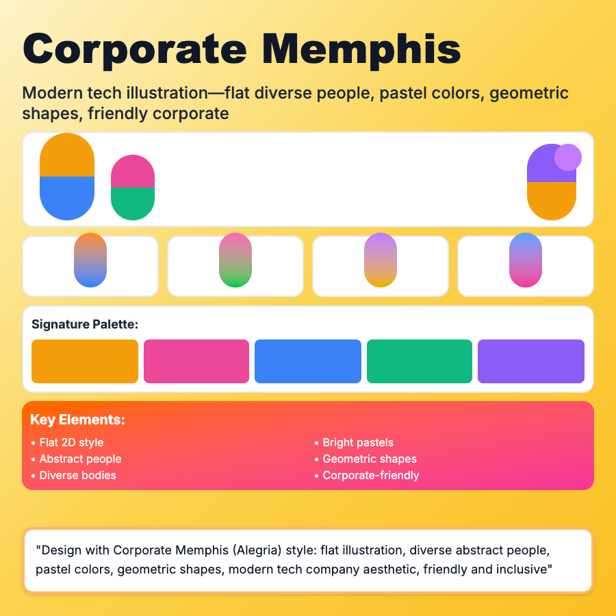 Corporate Memphis Design (aka Alegria, Big Tech Memphis) features flat character illustrations with disproportionate limbs, simple faces, bright colors, and generic diversity. Became ubiquitous in tech/corporate from 2017-2020. Often criticized as soulless.