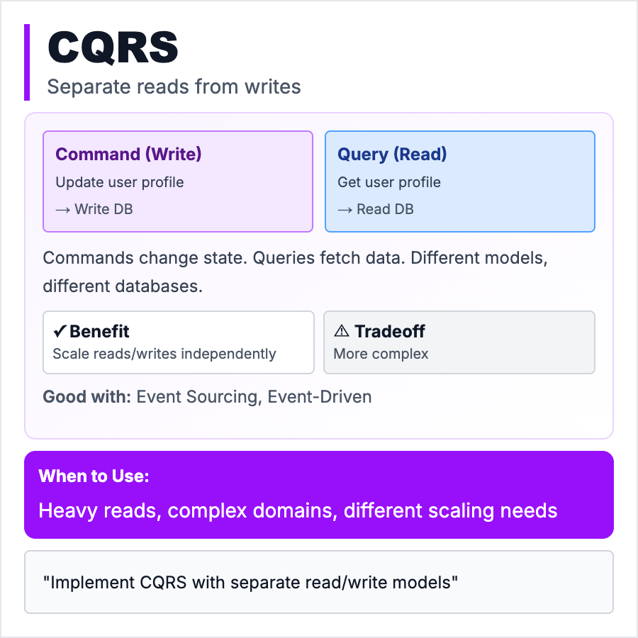 CQRS (Command Query Responsibility Segregation) separates read and write operations into different models. Commands (writes) update one database optimized for writes. Queries (reads) read from a different database optimized for reads. Often paired with Event Sourcing. Allows independent scaling of reads/writes, different data models per use case. Adds complexity—eventual consistency, maintaining sync, more code. Only use when reads/writes have very different needs.