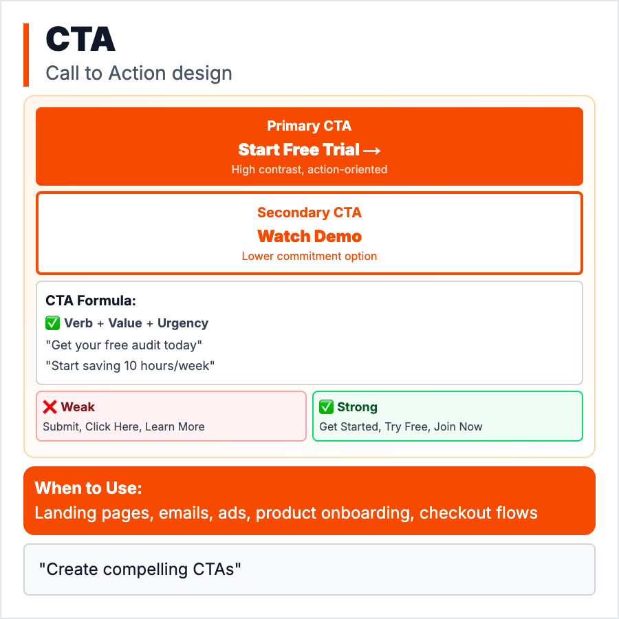 Use CTAs everywhere you want user action: landing pages, emails, blog posts, pricing pages, signup flows. Every page should have one primary CTA (what you most want them to do) and optionally secondary CTAs (alternatives). The key is making the desired action obvious and low-friction.