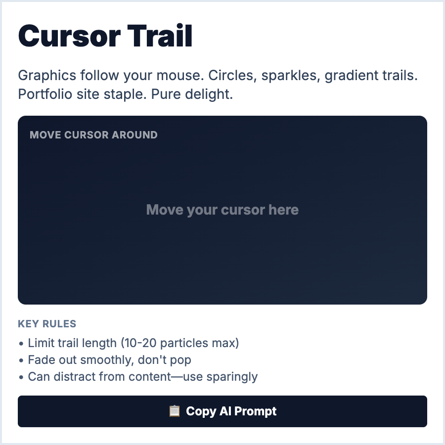 Cursor Trail adds visual elements following mouse movement—particles, sparkles, gradients, or custom shapes. Uses JavaScript to track cursor position and render elements. Creates playful, magical, or premium feel. Should be subtle to avoid distraction.
