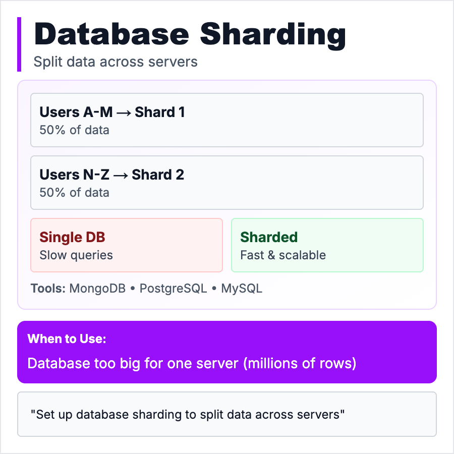Database Sharding splits your data across multiple databases—each "shard" holds a portion of your data. Users 1-1M on Shard 1, users 1M-2M on Shard 2, etc. Unlike replication (same data copied to many servers), sharding splits different data to different servers. Allows infinite scaling but adds complexity. Most startups never need sharding—vertical scaling and read replicas handle 99% of cases.
