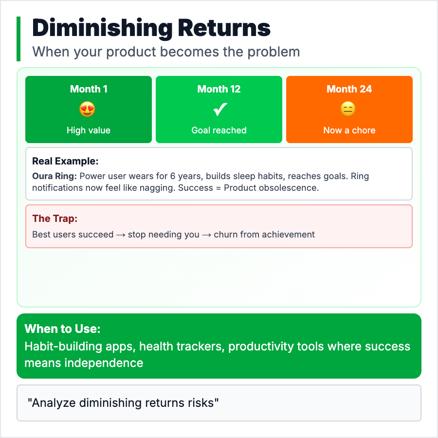 Diminishing Returns means each additional unit of effort produces less output. First optimization improves conversion 20%, second improves 5%, third 1%. At some point, you're spending weeks for tiny gains. Better to move on to new opportunities. Related to Pareto Principle (80/20 rule)—first 20% of effort gets you 80% of results. Know when to stop and work on something with more leverage.