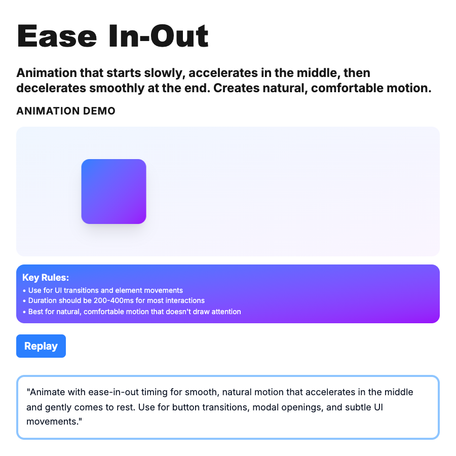 Ease In Out is an animation timing function that starts slow, accelerates in the middle, then decelerates at the end. Creates natural-feeling motion—like how objects move in real life. Most common and versatile easing curve. Default for most UI animations. Feels smooth and professional.
