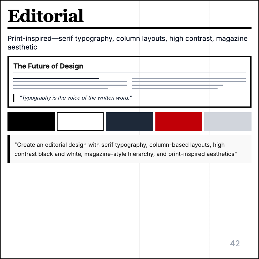 Editorial Design brings magazine and newspaper layouts to digital—bold typography, structured grids, large imagery, pull quotes, and content-first hierarchy. Emphasizes readability and visual storytelling over decoration.