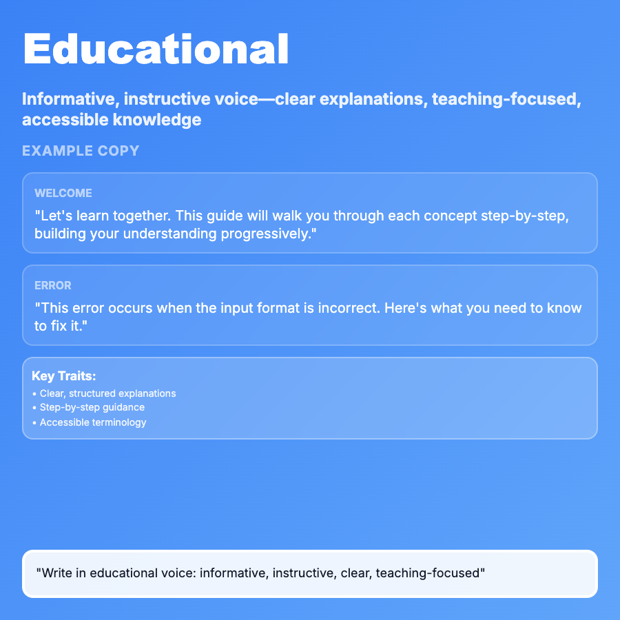 Educational Tone teaches concepts clearly using step-by-step explanations, concrete examples, and helpful analogies. It breaks down complexity without being condescending, assuming intelligence while not assuming knowledge. Essential for onboarding, documentation, tooltips, help centers, and introducing complex features.