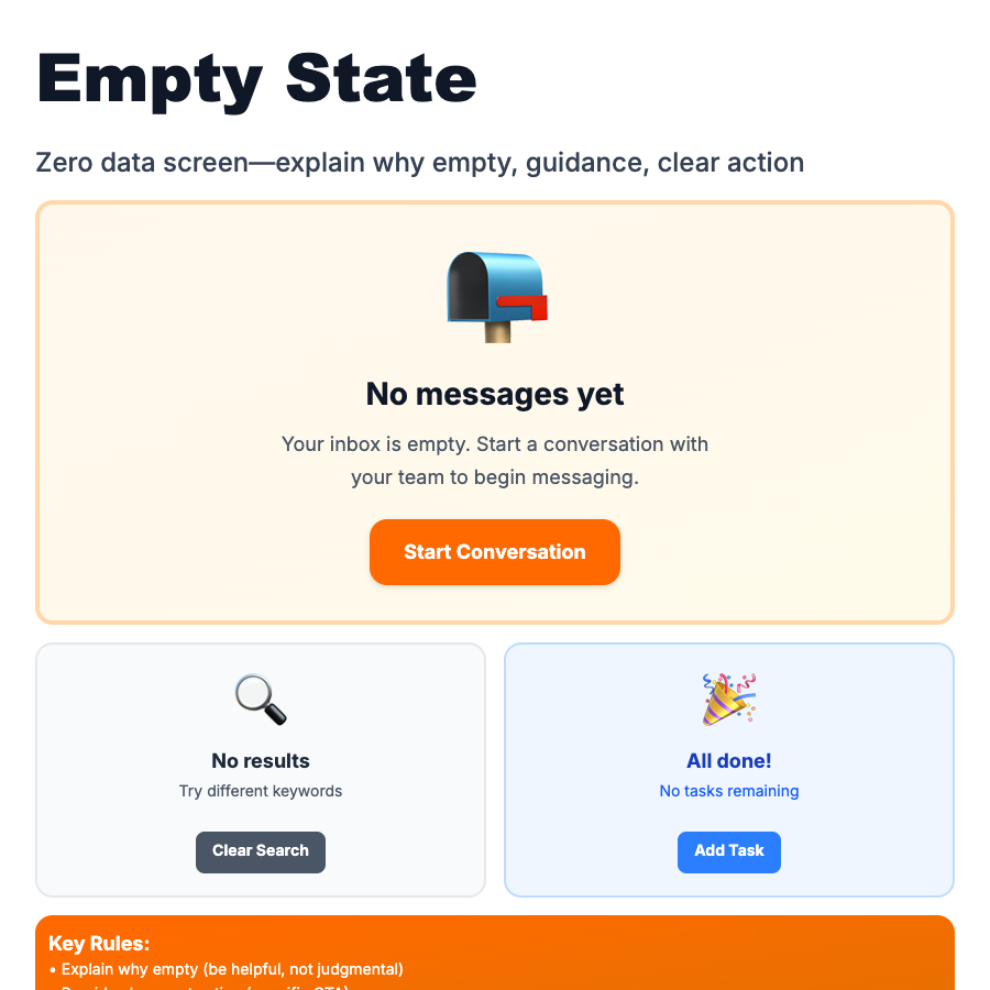 Empty States appear when there's no content to display—new account, cleared inbox, no search results. Instead of blank space, show helpful message, illustration, and action (Create, Import, Learn). Opportunity to guide users and reduce friction. First impressions for new users.