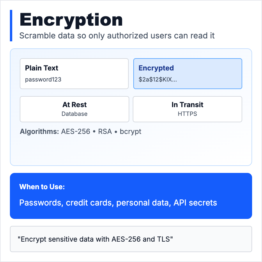 Encryption transforms readable data into scrambled ciphertext that can only be decrypted with the right key. Two types: encryption at rest (data stored in databases, files) and encryption in transit (data sent over networks). Use HTTPS/TLS for transit, AES-256 for at rest. Encryption protects data from breaches, eavesdropping, and unauthorized access.