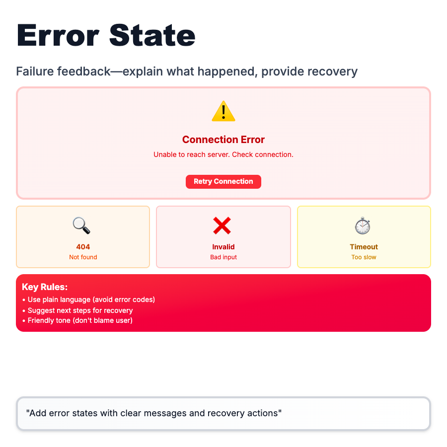 Error States explain what went wrong and how to fix it. Good error states are specific, actionable, and empathetic. Include: what happened, why it happened (if known), how to fix it, and retry/recovery action. Use plain language, not technical jargon. Show inline (form errors), banner (page errors), or dedicated page (404, 500).