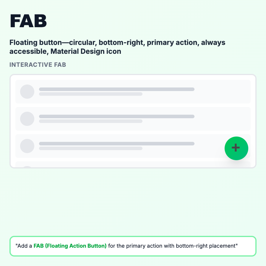 A Floating Action Button (FAB) is a circular button that floats above the UI, usually in the bottom-right corner, representing the primary action on a screen. Think Gmail's compose button or Google Maps' directions button. It's always visible and accessible, making the most important action obvious. Introduced by Material Design, now common across mobile apps.