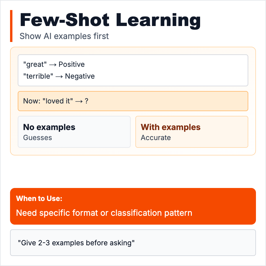 Few-Shot Learning means giving the AI 2-5 examples before asking it to do a task. "Here are 3 examples of how to classify emails as spam/not spam. Now classify this one." AI learns the pattern from examples and applies it. Much more accurate than zero-shot (no examples) for complex or specific tasks. Works via "in-context learning"—AI infers the pattern without changing model weights. Sweet spot: 2-5 examples, more doesn't help much.