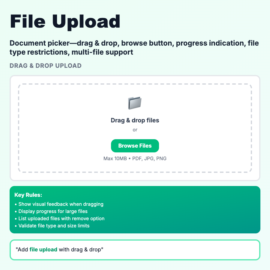 File Upload lets users select files from their device to send to your server. Includes file picker button, drag-and-drop zone, progress indicator, preview, and error handling. Critical for apps that handle documents, images, videos, or any user-generated files.
