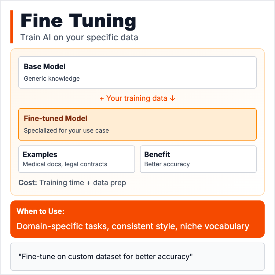 Fine-Tuning means training an existing AI model on your own data to customize its behavior. Takes a base model (GPT-4, Claude) and teaches it your specific patterns, style, or knowledge. More permanent than prompting—changes model weights. Requires 100-10,000 examples and costs money/time to train. Result: model that behaves consistently according to your needs. Use when prompting isn't good enough and you need permanent customization.