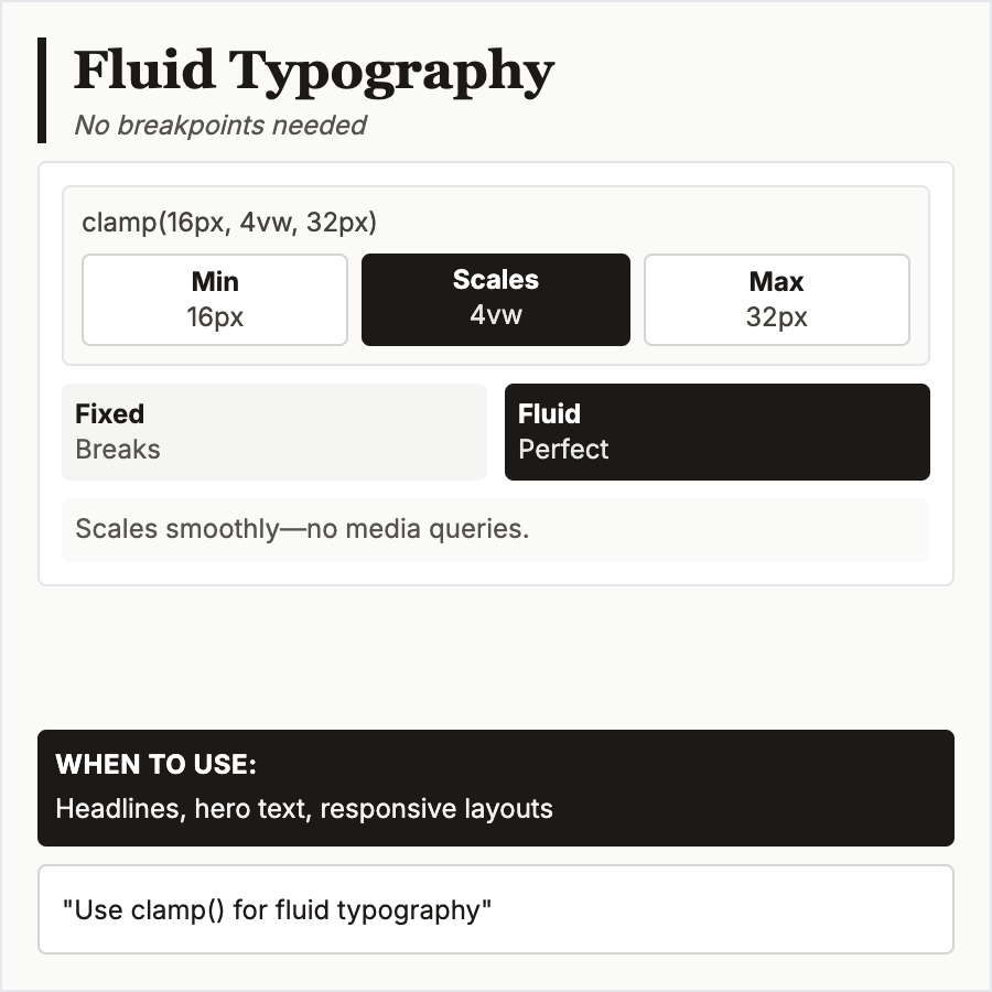 Use fluid typography for modern responsive sites, especially content-heavy designs where smooth scaling improves reading experience. Works well for headings that need dramatic size differences between mobile and desktop.