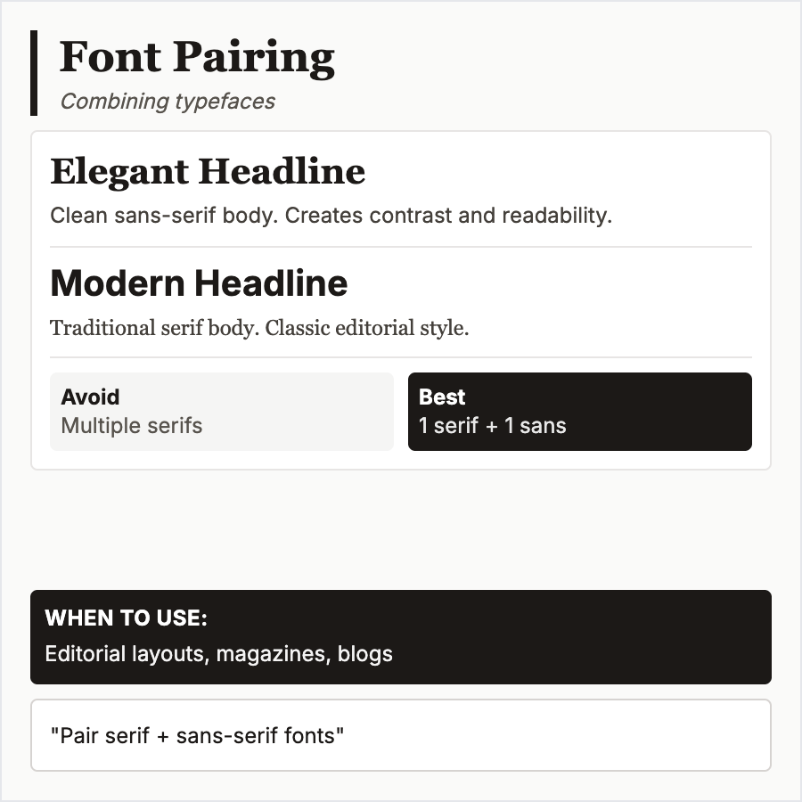 Use font pairing for all digital products—differentiate headings from body text. Essential for content-heavy sites, editorial design, and branding. Even minimalist designs need at least two weights/styles for hierarchy.
