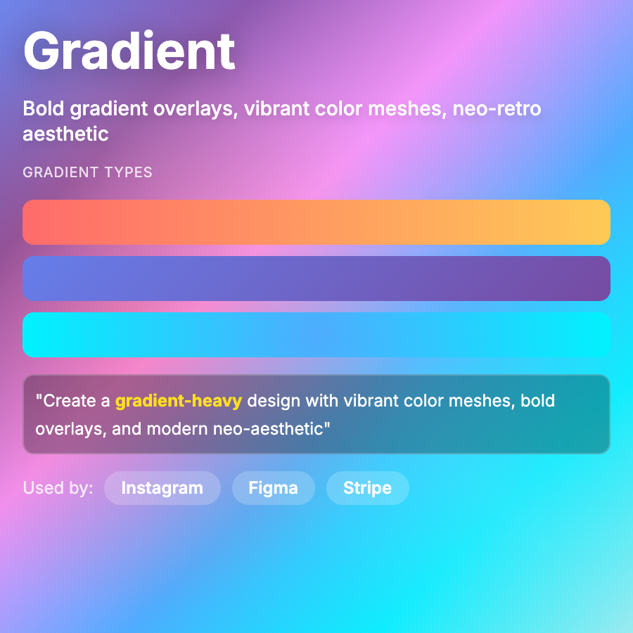 Use gradients for backgrounds, buttons, illustrations, or brand elements. Works across most product types. Subtle gradients add polish to minimalist designs; bold gradients work for consumer/creative products. Very popular in modern web design.