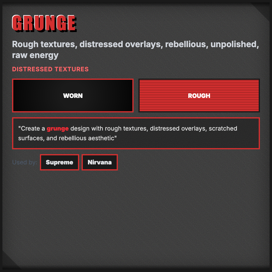 Grunge Design features distressed textures, rough edges, overlapping elements, muted colors, and raw aesthetics. Inspired by 90s alternative/punk culture, grunge intentionally looks unpolished and rebellious. Creates authentic, anti-establishment feel.