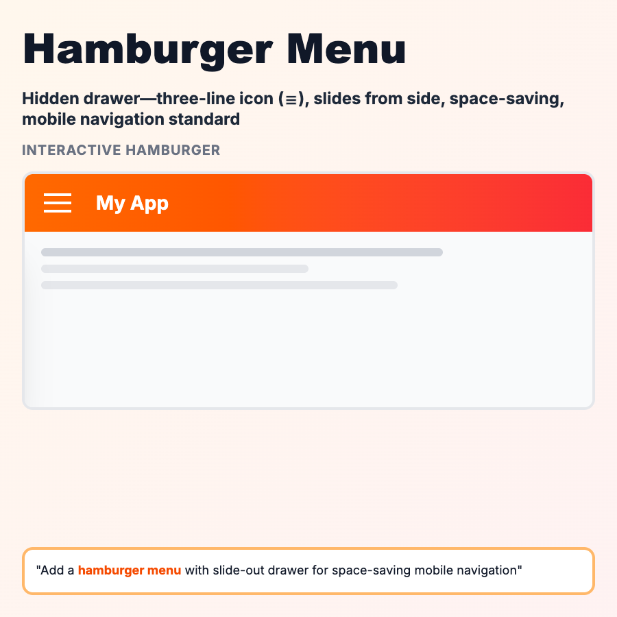 The hamburger menu is the three-line icon (☰) that opens a hidden navigation drawer. It saves screen space by hiding navigation until needed. Common on mobile sites and apps where screen space is limited. While popular, it has usability downsides—users can't see navigation options without tapping, which can reduce engagement and discoverability.