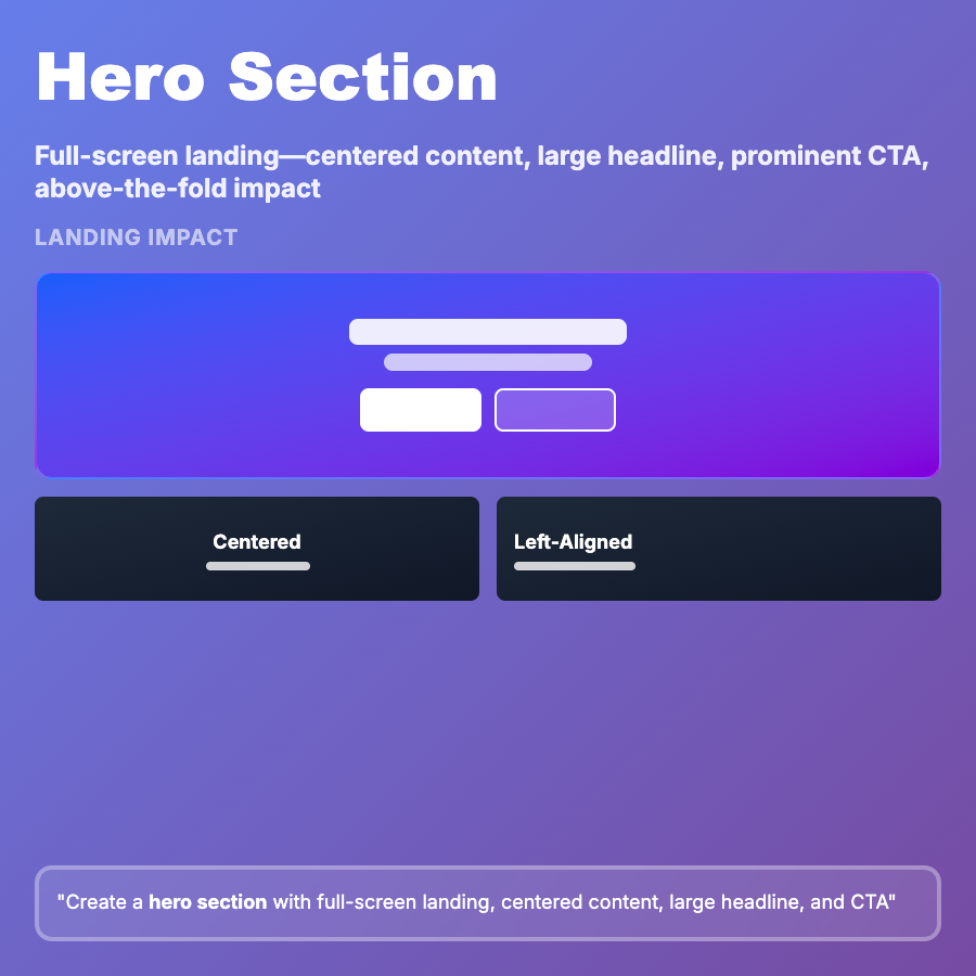 Hero Section is the prominent above-the-fold content at the top of landing pages—typically includes large headline, supporting copy, primary CTA button, and hero image or video. It serves as the first impression and should communicate value proposition within seconds. Standard in marketing sites, SaaS homepages, and product pages.