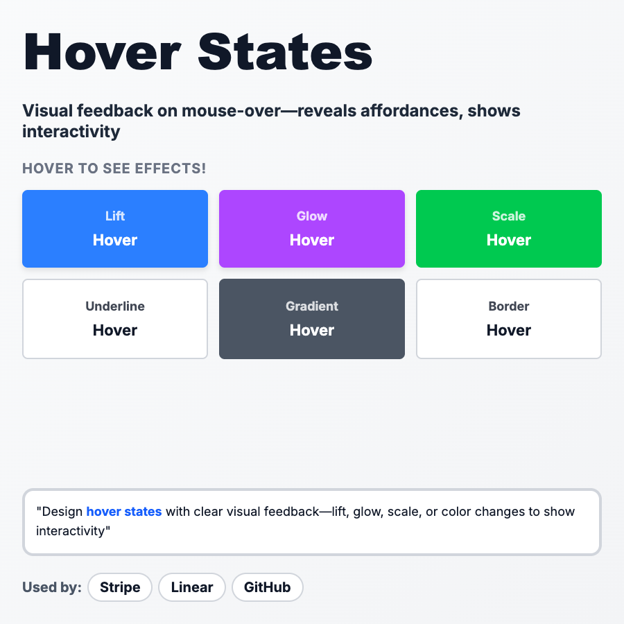 Hover States are visual changes that happen when you mouse over an interactive element (button, link, card). Signals "this is clickable" and provides instant feedback. Common effects: color change, underline, shadow, scale, brightness. Essential for desktop UX, but remember—hover doesn't exist on mobile.