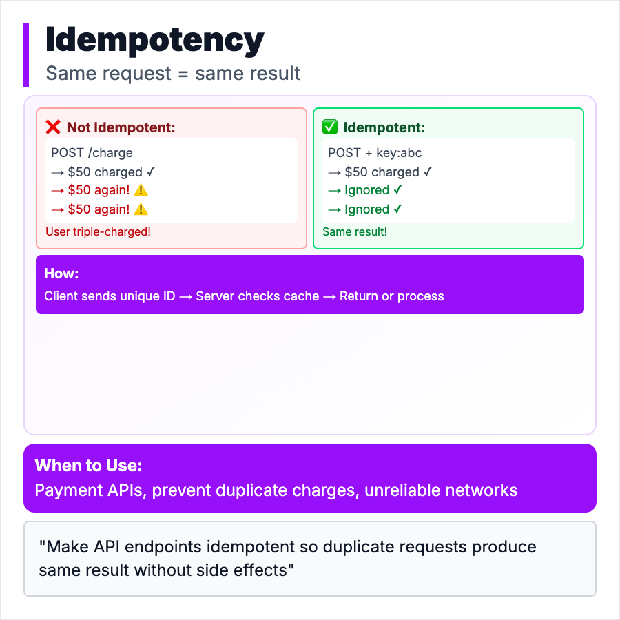 Idempotency means an operation can be called multiple times with the same result. Charging a credit card is NOT idempotent (charge twice = double charge). Creating a user with "create if not exists" IS idempotent (call twice = one user). Critical for payments, APIs, and any operation that could be accidentally retried. Implement with idempotency keys—client sends unique ID, server checks "already processed this ID?"