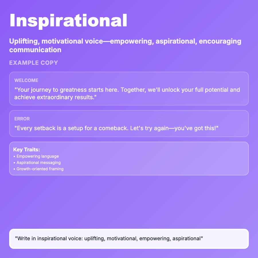 Inspirational Tone motivates users toward their goals using aspirational language, possibility-focused messaging, and achievement celebration. It emphasizes potential, progress, and empowerment without being preachy or unrealistic. Common in fitness apps, education platforms, creative tools, and personal development products.