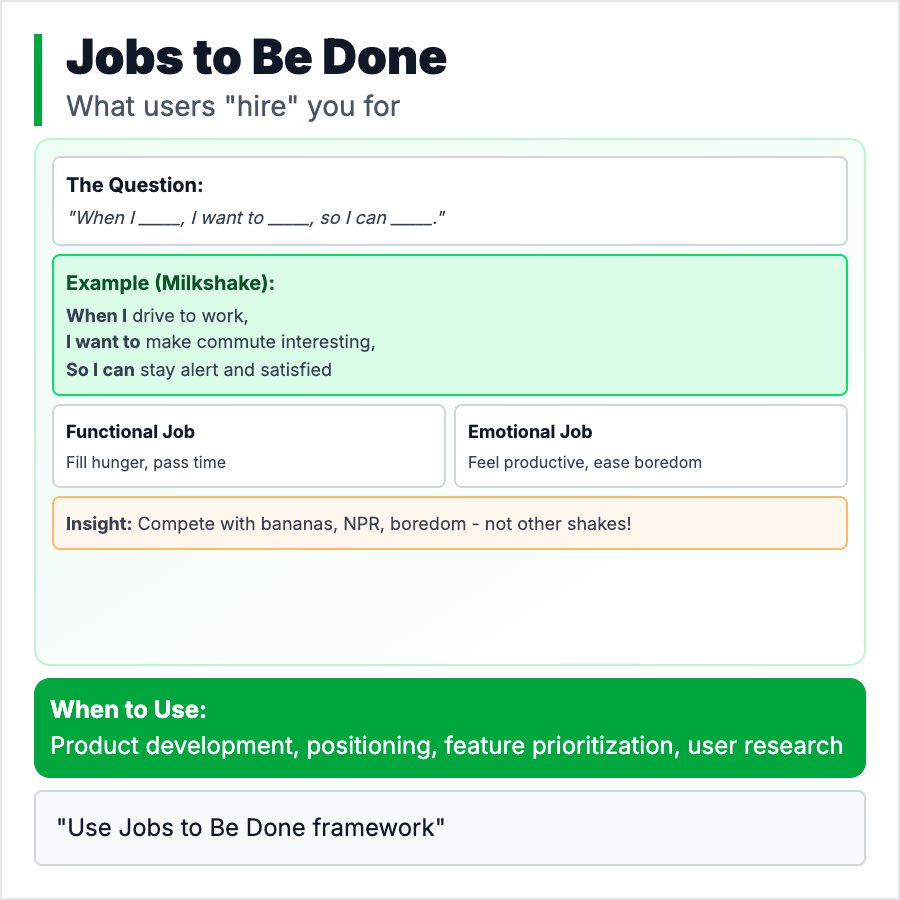 Use JTBD in customer interviews—ask "What were you trying to accomplish?" instead of "What features do you want?" Use it to understand why customers switch from competitors (what job weren't they doing?). Use it for positioning—"We help [customer] do [job] without [pain]." Best for products where the job is non-obvious or where you compete with unexpected alternatives.