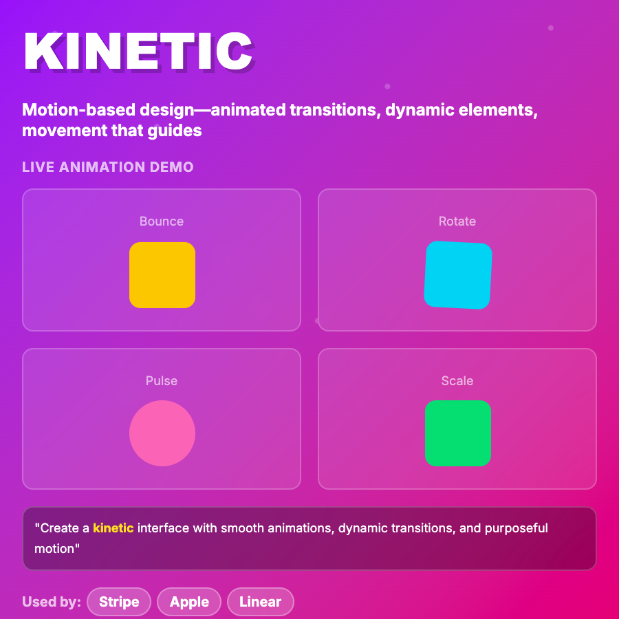 Kinetic Interaction applies physics principles (momentum, inertia, friction) to UI elements so they move naturally in response to user input. Think iPhone scrolling—swipe fast and it keeps moving, gradually slowing down like a real object. Makes interfaces feel tangible and responsive, not robotic. Common in mobile apps, touch interfaces, and modern web apps.