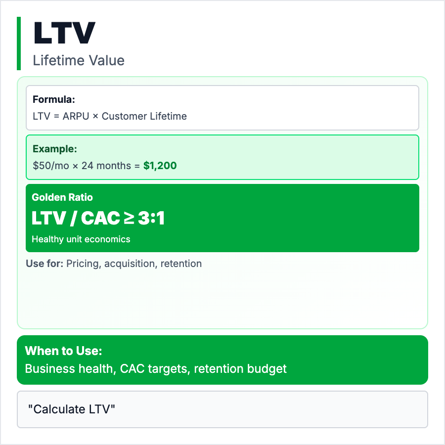 LTV (Lifetime Value) is the total profit a customer generates over their entire relationship with you. Formula: (Average Revenue Per User × Gross Margin) ÷ Churn Rate. Example: $100/mo subscription, 80% margin, 5% monthly churn = $1,600 LTV. Used with CAC to determine if your business model works (aim for LTV/CAC > 3). Higher LTV means you can spend more to acquire customers.