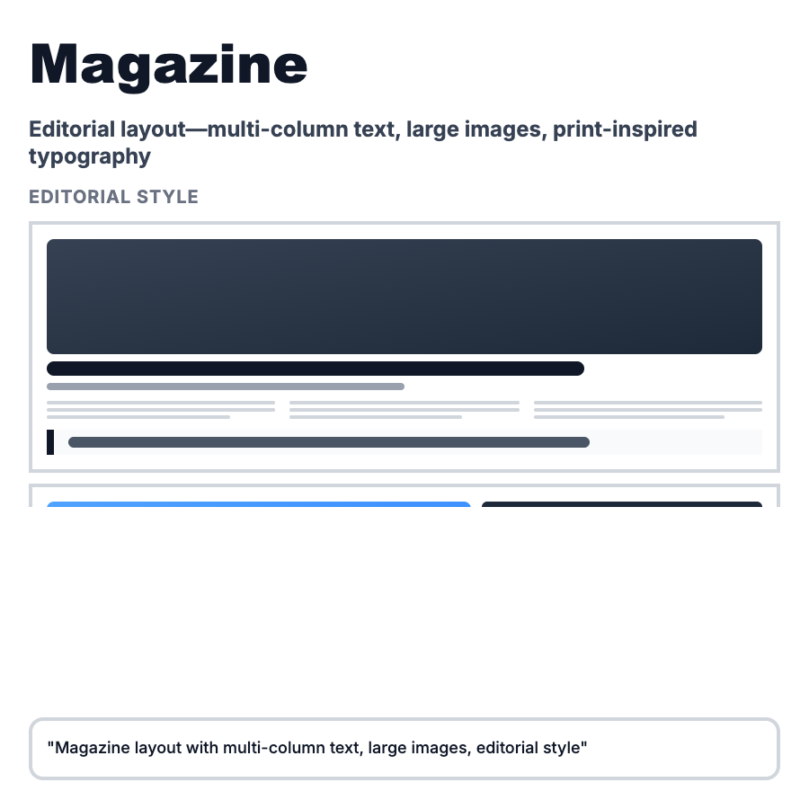 Magazine Layout applies editorial design principles to web—large hero images, varied typography hierarchy, asymmetric composition, pull quotes, and generous whitespace. It prioritizes storytelling and reading experience over strict grid uniformity. Common in blogs, online publications, portfolios, and marketing sites where content quality and presentation drive engagement.