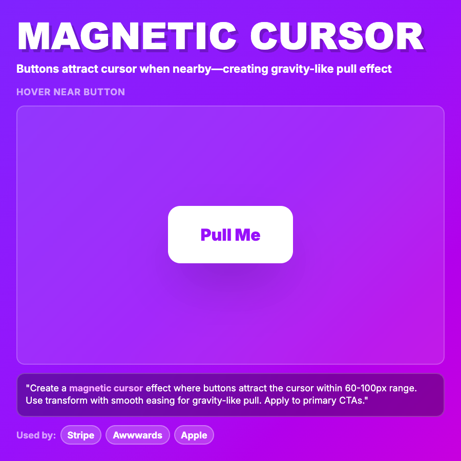 Magnetic Cursor makes UI elements (buttons, links) subtly move toward cursor as it approaches, creating magnetic attraction effect. Uses JavaScript to calculate distance and translate elements. Adds playful premium feel. Popular in modern web design.