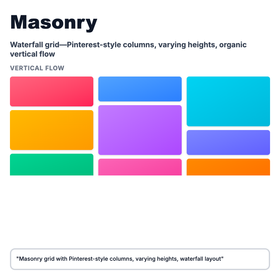 Masonry Layout arranges content in vertical columns where items flow into the next available space, creating a Pinterest-style "waterfall" effect. Unlike standard grids, item heights vary and columns fill vertically to minimize gaps. Perfect for image galleries, product catalogs, and content discovery interfaces where items have different aspect ratios.