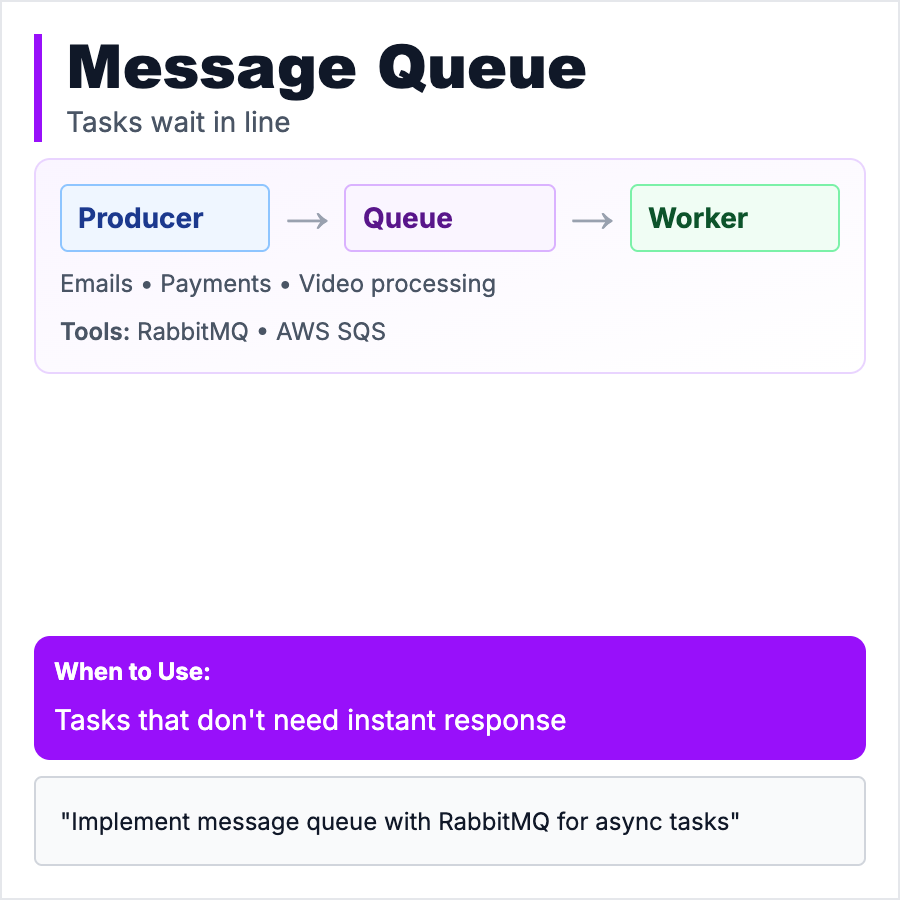 A Message Queue lets services communicate asynchronously—Service A puts a message in the queue, Service B processes it later. User uploads video → queue "encode video" job → worker processes it in background → notify user when done. Decouples services, handles traffic spikes, enables retries. Like a todo list for your backend. Common tools: RabbitMQ, Redis Queue, AWS SQS, Kafka for high-volume streams.