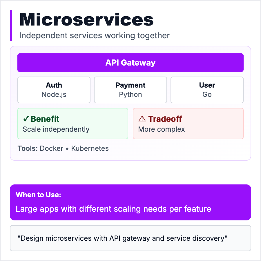 Microservices Architecture splits your app into independent services that communicate over APIs. User Service, Payment Service, Notification Service—each runs separately, has its own database, and can be deployed independently. Opposite of Monolith (everything in one codebase). Benefits: team autonomy, independent scaling, language flexibility. Costs: complexity, network calls, distributed debugging. Most startups should start with monolith.
