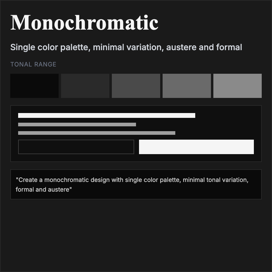Use monochromatic for luxury brands, minimalist products, editorial design, photography portfolios, or brands with strong signature colors. Works well when you want restrained, sophisticated appearance or to highlight content over UI.