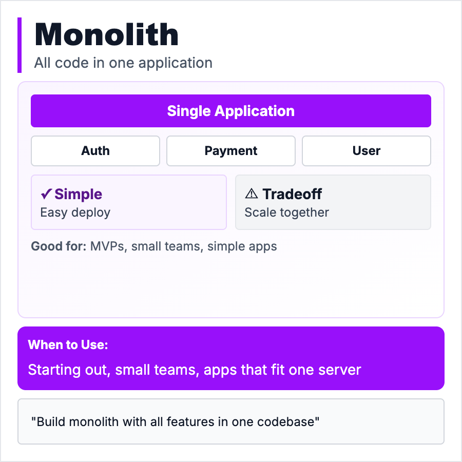 Monolith Architecture means your entire application runs as a single unit—one codebase, one database, one deployment. Opposite of microservices (split into many services). Monoliths are simpler: easier to develop, test, deploy, debug. Most successful startups started as monoliths—Shopify, GitHub, Basecamp still run monoliths. "Modular monolith" (well-organized code) scales better than poorly-designed microservices. Only move to microservices when monolith becomes painful.