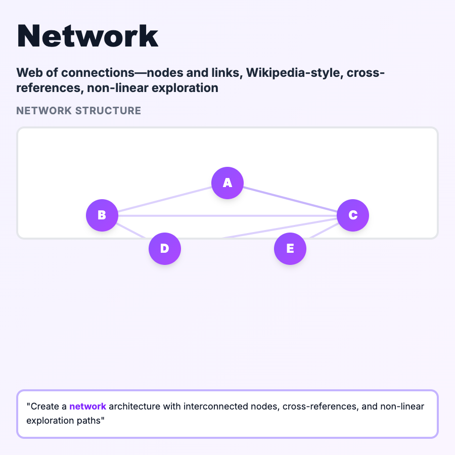Use network IA for wikis, knowledge bases, documentation with heavy cross-referencing, or when content has many-to-many relationships. Works best when combined with strong search and breadcrumbs (since users can enter from anywhere). Essential for Roam/Obsidian-style bidirectional linking. Avoid for linear processes or when users need guided navigation.