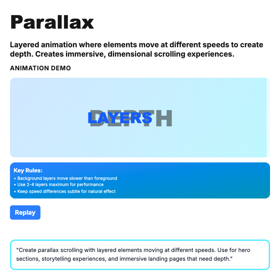 Use parallax for marketing pages, hero sections, portfolio sites, or storytelling experiences where visual wow-factor matters. Keep subtle (20-30% speed difference) for comfort. Common trigger: scroll position or mouse movement. Use transform for performance. Always respect prefers-reduced-motion. Don't use on content-heavy pages or apps where readability is critical.