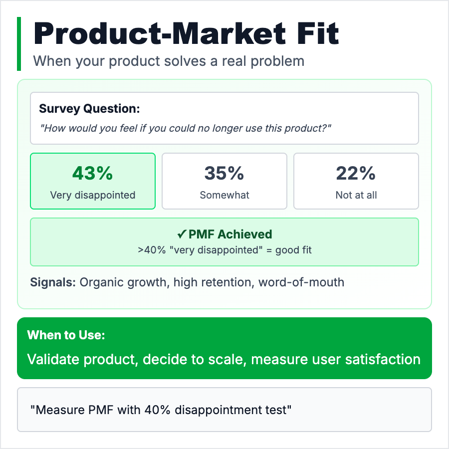 Product-Market Fit (PMF) is when you've built something people want so badly they'll pull it out of your hands. You know you have it when users stick around, tell their friends, and would be "very disappointed" if your product disappeared. Before PMF, growth is hard. After PMF, retention takes care of itself. Most startups die before finding it.