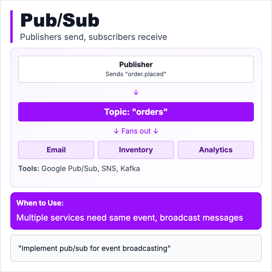 Use pub/sub when one event should trigger multiple actions (user signup → email, analytics, CRM), when you want decoupled services (publisher doesn't know subscribers), for real-time notifications to many clients, or for event-driven microservices. Don't use when only one service should process message (use queue instead). Start simple, add pub/sub when you need fan-out.