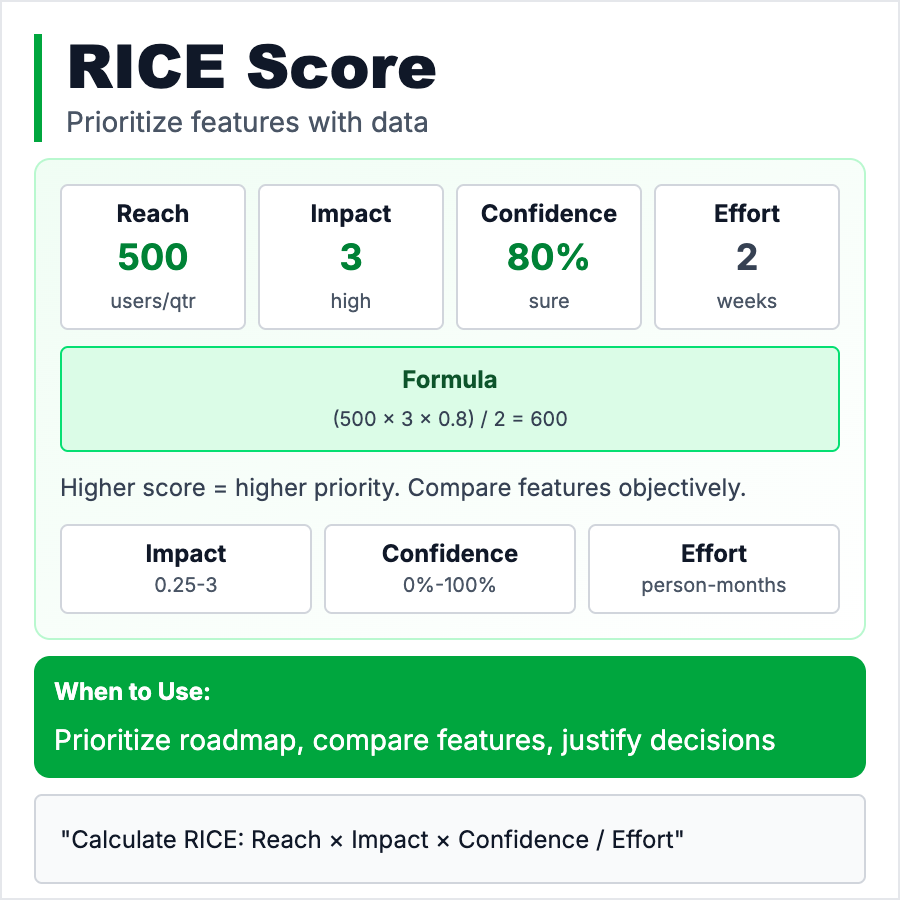 RICE Score is a prioritization framework created by Intercom: Reach (how many users will this affect?), Impact (how much?), Confidence (how sure are we?), Effort (person-months to ship). Formula: (Reach × Impact × Confidence) ÷ Effort. Impact is scored (3=massive, 2=high, 1=medium, 0.5=low, 0.25=minimal). More rigorous than ICE because it accounts for how many users benefit.