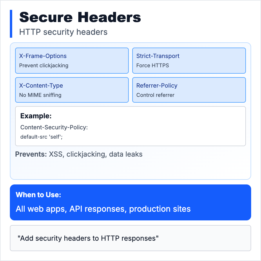 Secure Headers are HTTP response headers that tell browsers how to handle security policies—preventing XSS, clickjacking, MIME sniffing, and other attacks. Key headers: Content-Security-Policy (CSP), Strict-Transport-Security (HSTS), X-Frame-Options, X-Content-Type-Options, Referrer-Policy. Easy to add, huge security impact.