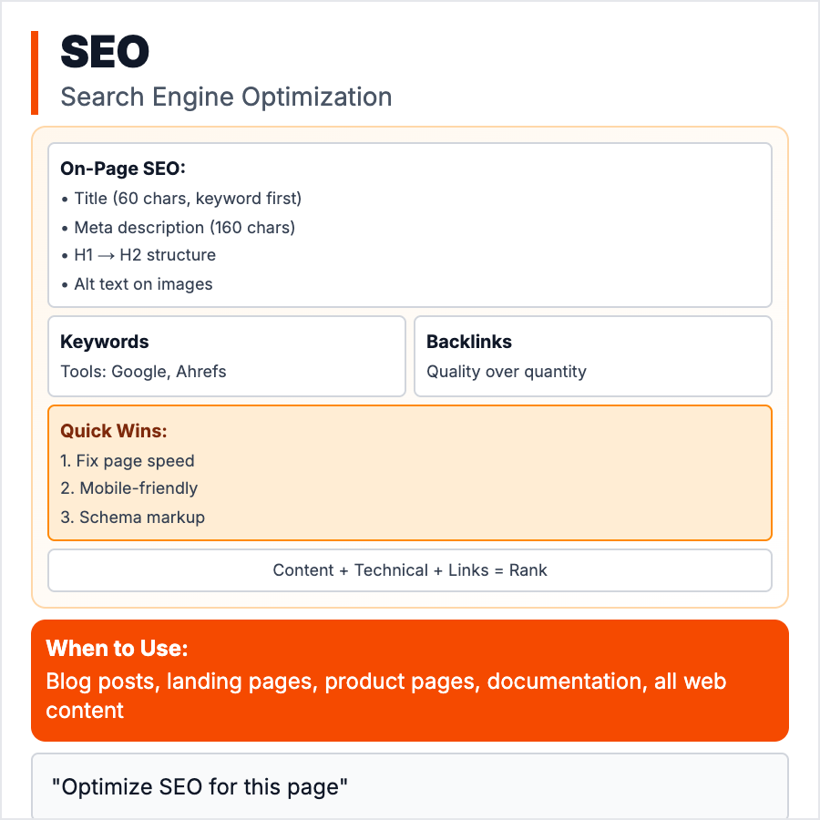 SEO (Search Engine Optimization) is making your website show up when people search Google for problems you solve. Unlike paid ads, SEO traffic is "free" (though it takes time to build). Good SEO means understanding what your customers search for, creating content that answers those searches, and making sure Google can find and rank your pages.