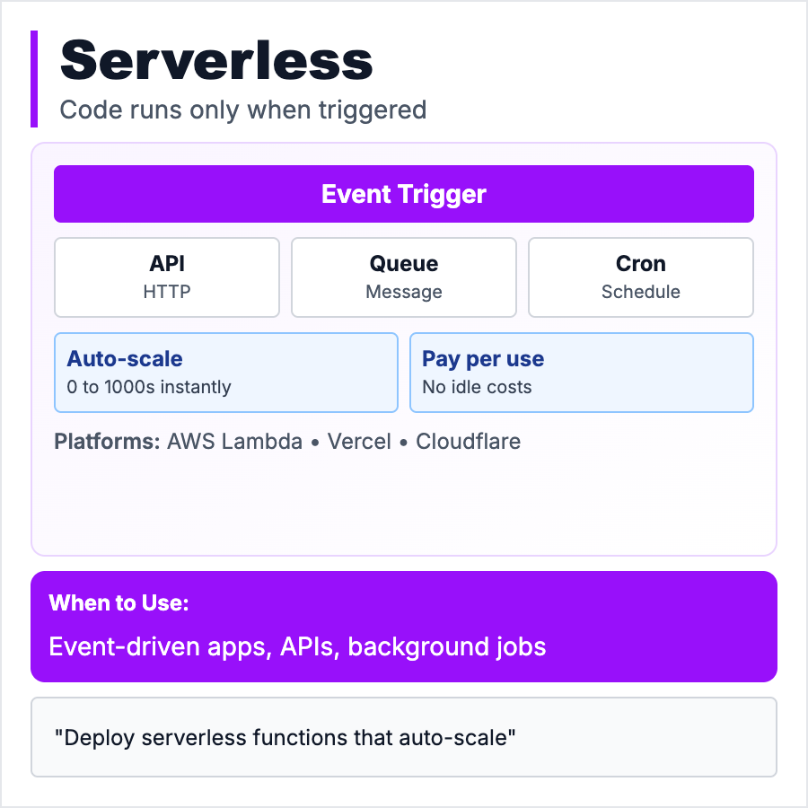 Serverless lets you run code without managing servers—you write functions, cloud provider runs them. AWS Lambda, Vercel Functions, Cloudflare Workers. Pay per execution, auto-scales to zero (no cost when idle), scales infinitely. Perfect for event-driven workloads (process uploaded file, send email, webhook handler). Not actually "serverless"—servers exist, you just don't manage them. Great for startups, avoid DevOps complexity.
