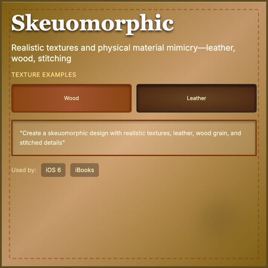 Skeuomorphic Design mimics real-world materials and objects in digital interfaces. Think leather textures, wood grain, stitched leather, page-turn animations, and buttons that look physically pressable. Dominated early iOS design before flat design took over.